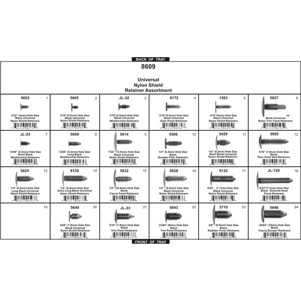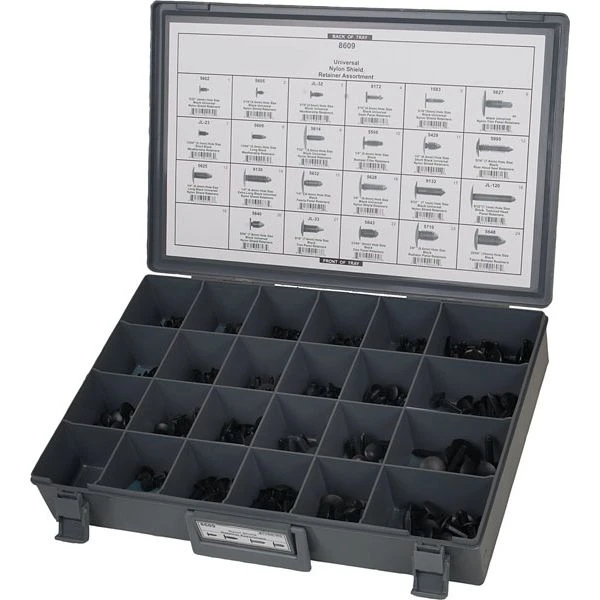 Don’t let your progress stall or stop because you don’t have the small fasteners that you need to get the job done right. Eastwood’s shop and restoration fastener program ensures you have everything you need to finish your job. These are high quality automotive products, not department store fasteners. New fasteners make a project look great and shows that you pay attention to the details, plus they ensure safety, reliability and peace of mind. Kit includes 311 Universal Black Nylon Retainers in 23 different sizes.